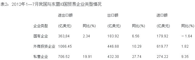 D. 2012年l一7月,國有企業(yè)與東盟10國的進(jìn)出口額占比較上年同期上升1.1個(gè)百分點(diǎn)
