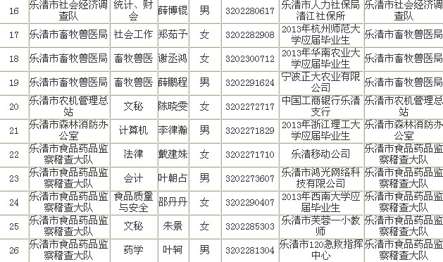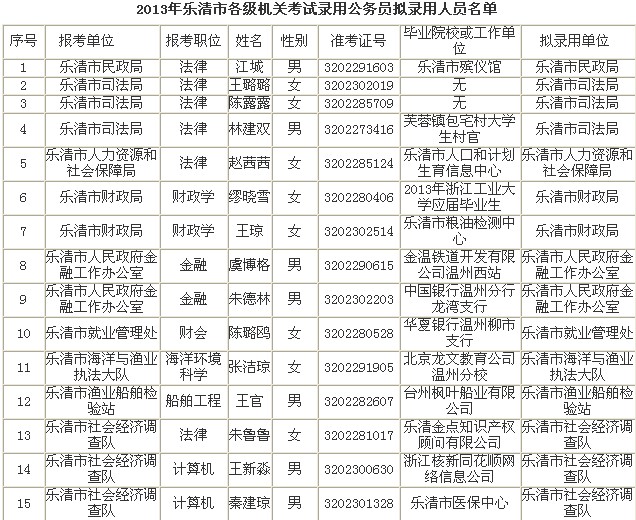 2013年浙江樂清市擬錄用公務(wù)員名單公示(1)