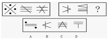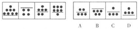 解析:選A。此題考查圓點數。題干部分圓點數:8、4、6、7,呈現亂序規(guī)律,所以要填5個圓點的,也就是A或者B。我們觀察頭發(fā)現有一條線分為線上部分和線下部分,那么我們分別數找規(guī)律。線上部分交點數:8、0、4、6,呈現亂序的規(guī)律,所以要填的圖應該是2個交點。線下部分交點數:0、4、2、1,呈現亂序的規(guī)律,所以要填的圖應該是3個交點,所以選擇A。
