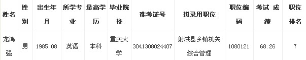 根據(jù)中共遂寧市委組織部、遂寧市人力資源和社會保障局《關(guān)于2013年上半年公開考試錄用公務(wù)員的公告》規(guī)定,龍鴻強(qiáng)同志經(jīng)筆試、面試、體檢和考察合格,擬錄用為公務(wù)員,現(xiàn)予以公示(人員情況如下)。