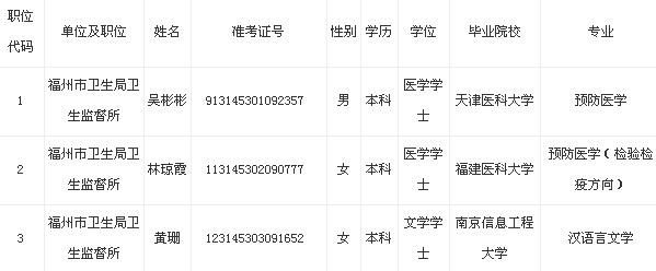 2013年福建省福州市公務(wù)員考試擬錄用公務(wù)員名
