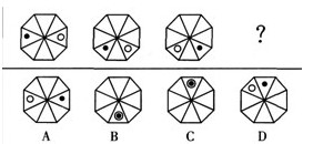 答案:C 解析:本題屬于位置類,主要考察平移。小黑點(diǎn)依次逆時針移動1格,2格;小白圈依次順時針移動1格,2格;照此規(guī)律,小黑點(diǎn)再逆時針移動3格,小白圈再順時針移動3格得到下一幅圖形。所以選擇C選項。