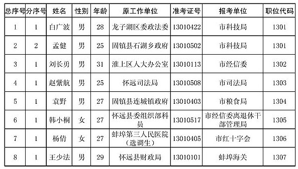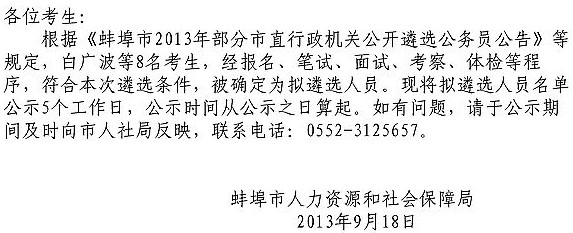 2013年安徽蚌埠市直行政機(jī)關(guān)擬錄用公務(wù)員名單