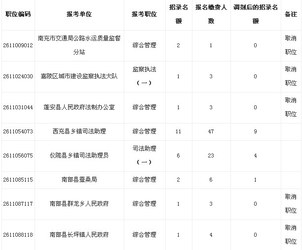根據(jù)《南充市人力資源和社會保障局關(guān)于2013年下半年公開考試錄用公務(wù)員(參照公務(wù)員法管理的工作人員)的公告》精神,現(xiàn)將2013年下半年公開考試錄用公務(wù)員(參照公務(wù)員法管理的工作人員)報名繳費(fèi)人數(shù)與職位錄用名額之比低于5:1,需縮減或取消職位錄用計(jì)劃的情況(附件)予以公告。