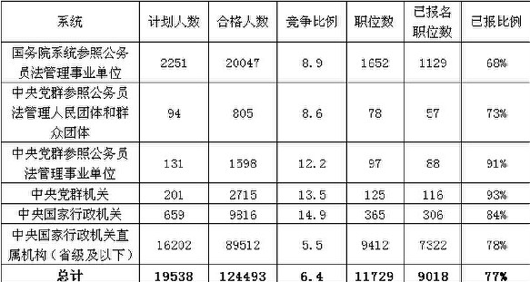 截止到10月18日8時,國考總體審核通過人數(shù)為124493人,較去年同期的122430人,上升了2063人。平均競爭比例達(dá)6.4:1, 較去年同期的 5.86:1有所增大。