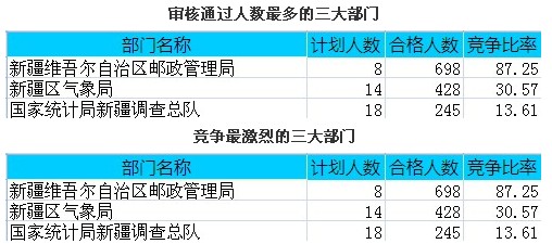 截止到10月18日8時,國考職位中新疆所屬職位通過審核總人數(shù)為2311人,共有91個職位無人通過審核,平均競爭比例為5.484:1。通過審核人數(shù)前三位的部門依次是:新疆維吾爾自治區(qū)郵政管理局、新疆區(qū)氣象局、國家統(tǒng)計局新疆調查總隊,分別是698、428、245三部門通過審核總人數(shù)達1371人,占通過審核總人數(shù)的59.3 %。