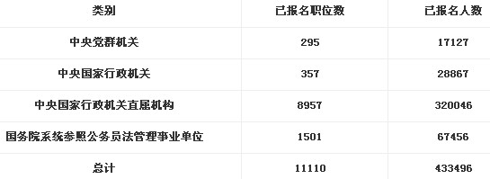 截至到10月21日上午09:30,2014年國家公務員考試共11110個職位已有考生報名(占總職位數(shù)的95%),報名人數(shù)總量達到433496。