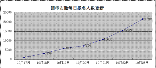 國(guó)考報(bào)名系統(tǒng)從10月16日8:00開(kāi)放,截至10月17日10:00,有1031人通過(guò)審核;截至10月18日6:30,共有3139人通過(guò)審核;截至10月19日6:30,共有5811人通過(guò)審核;截至10月20日8:00,共有7910人通過(guò)審核;截至10月21日 7:00,共有10630人通過(guò)審核;截至10月22日 7:00,共有15519人通過(guò)審核;截至10月23日 7:00,共有21509人通過(guò)審核。平均每天約有3000人通過(guò)安徽地區(qū)職位的審核,成為合格的報(bào)考者。
