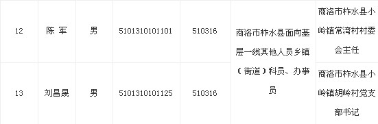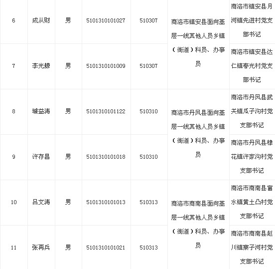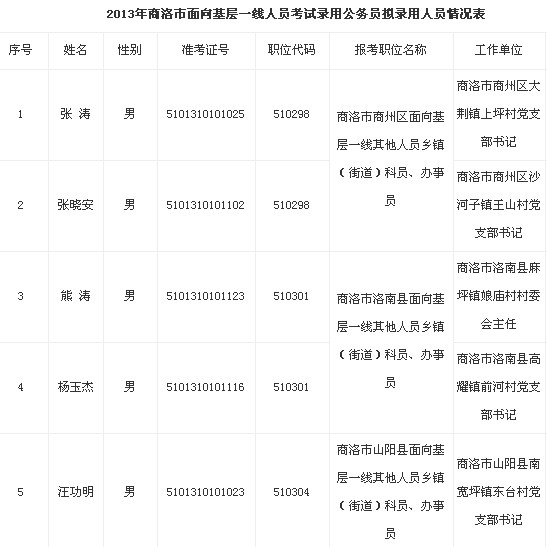 根據(jù)《2013年陜西省從優(yōu)秀工人農(nóng)民中考試錄用公務員工作公告》有關要求,經(jīng)推薦報名和筆試、面試、量化考察、體檢等程序,擬錄用下列同志為商洛市面向基層一線其他人員職位公務員,現(xiàn)予以公示,歡迎社會各界廣泛監(jiān)督。如有異議,可直接向商洛市委組織部或省委組織部公務員管理處反映。