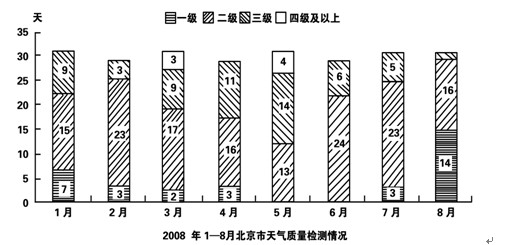 在2008年8月8日至24日奧運會期間,北京市的空氣質(zhì)量不僅天天達標,而且有10天達到一級,全面兌現(xiàn)了對奧運會空氣質(zhì)量的承諾。下圖是2008年1~8月北京市大氣質(zhì)量檢測情況,圖中一、二、三、四級是空氣質(zhì)量等級。一級空氣質(zhì)量最好,一級和二級都是質(zhì)量達標天氣。2008年北京的空氣質(zhì)量控制目標是全年達標天數(shù)累計達256天。