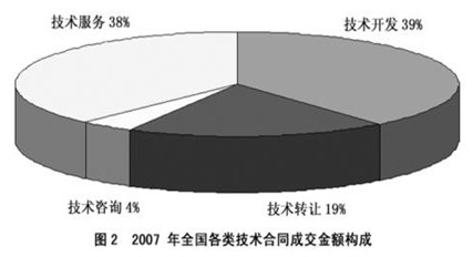 2007年全國共簽訂技術(shù)開發(fā)合同73320項,成交金額876億元,分別比上年增長了13.5%和22.2%;共簽訂技術(shù)轉(zhuǎn)讓合同11474項,成交金額420億元,成交金額同比增長30.8%;技術(shù)服務(wù)和技術(shù)咨詢合同成交金額分別為840億元和90億元,分別比上年增長了20.9%和5.9%。