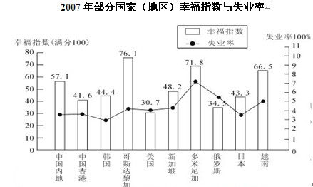 【解析】C。國(guó)民生產(chǎn)總值小于1000億美元為哥斯達(dá)黎加、多米尼加、越南,幸福指數(shù)均高于其他國(guó)家,A項(xiàng)正確;比中國(guó)內(nèi)地失業(yè)率低的國(guó)家為韓國(guó)和日本,幸福指數(shù)均低于中國(guó)內(nèi)地,C項(xiàng)正確。