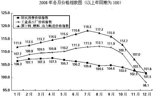 Ⅲ。2008年在圖中所示的幾個(gè)價(jià)格指數(shù)中,山東省原材料、燃料、動(dòng)力購(gòu)進(jìn)價(jià)格指數(shù)波動(dòng)最大