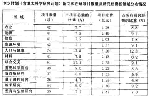 2009年,我國973計劃(含重大科學研究計劃)新立和在研項目共547項,其中新立項目123項,在研項目424項。國家財政共投入26億元。