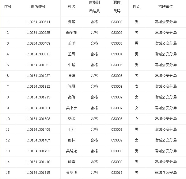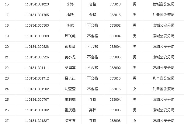 2013年安徽亳州政法干警遞補體能測試結(jié)果公布如下,