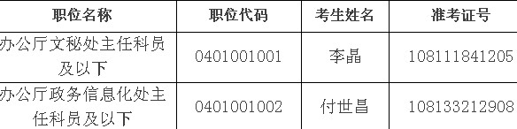 根據(jù)公務(wù)員招考有關(guān)規(guī)定和資格復(fù)審結(jié)果,擬在公共科目筆試合格的考生中,按照筆試成績從高到低的順序,遞補以下2位考生為面試人選: