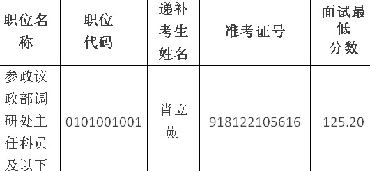 因部分考生自愿放棄面試資格,根據(jù)公務(wù)員招考有關(guān)規(guī)定,擬在公共科目筆試合格的考生中,按照筆試成績(jī)從高到低的順序遞補(bǔ)面試人選。具體情況如下: