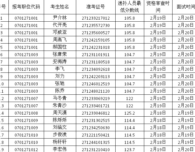 由于部分考生自愿放棄面試資格,根據(jù)中央機(jī)關(guān)及其直屬機(jī)構(gòu)公務(wù)員考試錄用有關(guān)規(guī)定,在公共科目筆試合格的考生中,按照筆試成績(jī)從高到低的順序,遞補(bǔ)以下考生為面試人選: