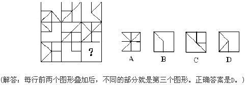 第一種題型:圖形推理。每道題給出一套或兩套圖形,要求報考者認真觀察找出圖形排列的規(guī)律,選出符合規(guī)律的一項。