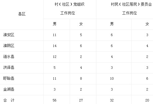 全市選聘到村(社區(qū))任職高校畢業(yè)生135名,其中淮安區(qū)25人、淮陰區(qū)30人、漣水縣20人、洪澤縣15人、盱眙縣35人、金湖縣10人,具體崗位要求如下: