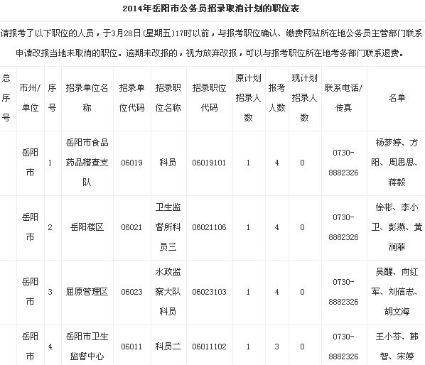 2014年湖南省岳陽市公務員考試職位調(diào)整公告