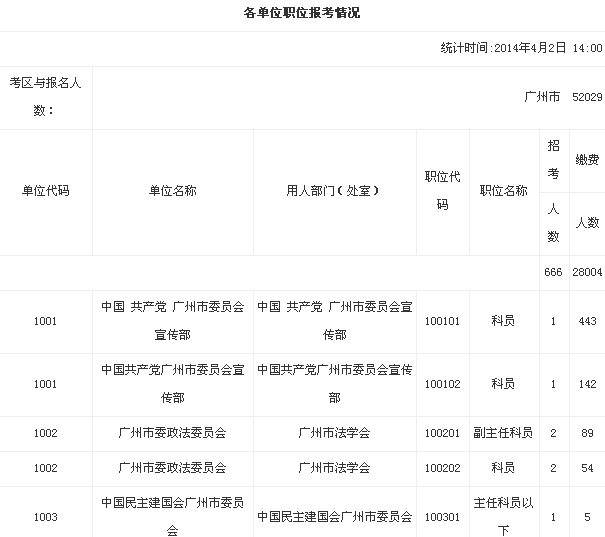 2014年廣東省廣州市公務(wù)員考試報名人數(shù)統(tǒng)計(4月2日)