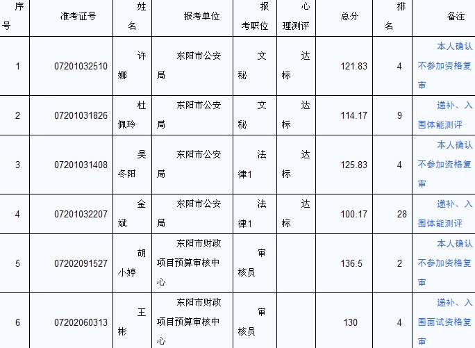 根據(jù)《2014年東陽市各級機關考試錄用公務員公告》規(guī)定,資格復審開始2天前,相關人員確認不參加資格復審的,由招錄機關在該職位筆試合格分數(shù)線以上的人員中從高分到低分的順序進行遞補,現(xiàn)將遞補資格復審、體能測評人員名單公告如下: