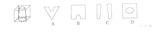 2014-福建-74、下列的立體圖形是立方體中挖出一個(gè)圓錐臺(tái)孔后形成的,如果從任一面剖開(kāi),以下哪一個(gè)不可能是該立體圖形的截面?