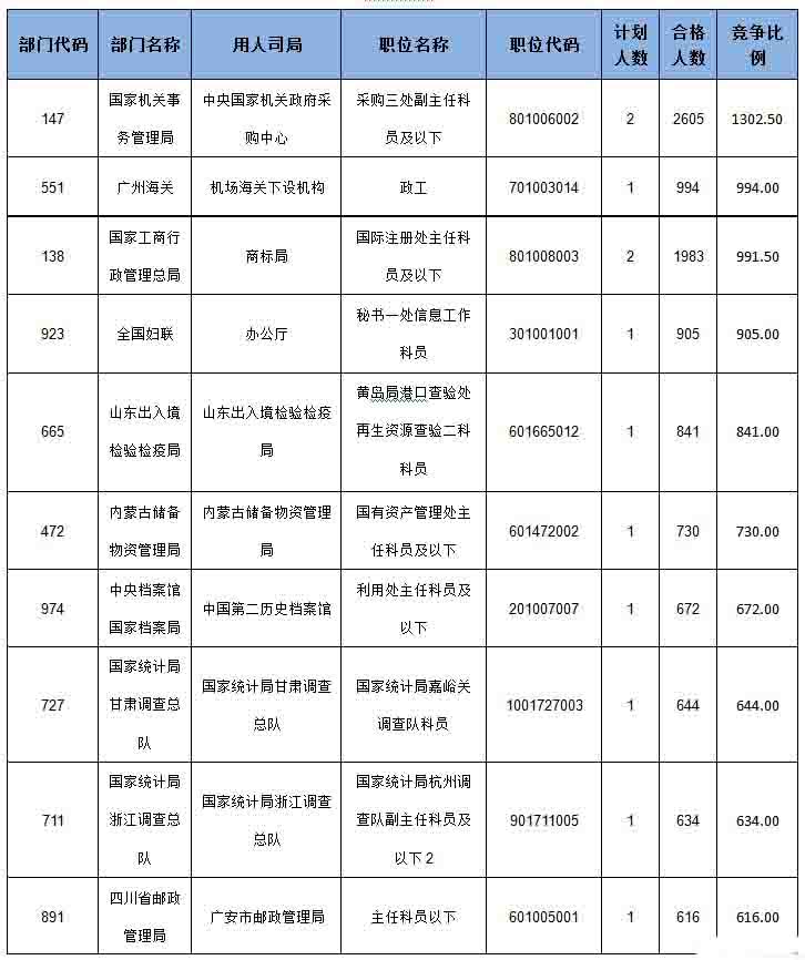 在參與招錄的490個部門中,山東省國家稅務(wù)局審核通過的人數(shù)仍位居榜首,已過審16208人;內(nèi)蒙古儲備物資管理局職位的競爭最為激烈,招錄2人,過審1004人,平均競爭比達(dá)502:1。