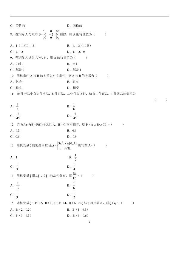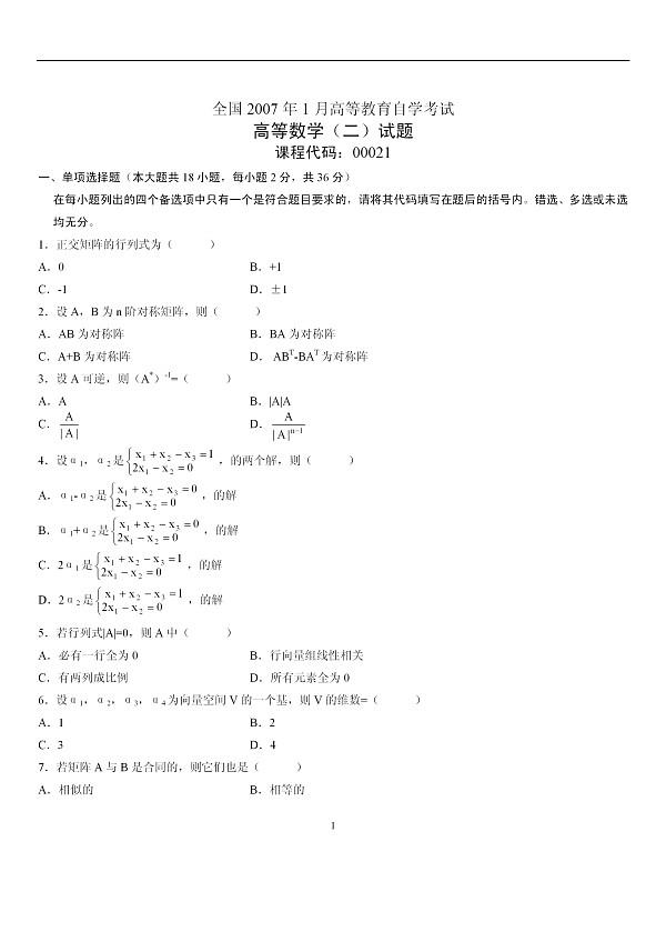 07年1月高等教育自學(xué)考試高等數(shù)學(xué)(二)試題