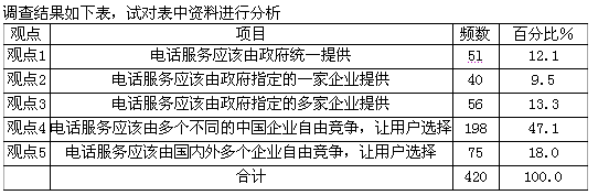 1994年中國(guó)聯(lián)通公司的正式成立,標(biāo)志著中國(guó)的電信服務(wù)市場(chǎng)在對(duì)內(nèi)的局部開(kāi)放中轉(zhuǎn)向有限競(jìng)爭(zhēng)。普通消費(fèi)者心目中合理的競(jìng)爭(zhēng)態(tài)勢(shì)如何呢?天津市某市場(chǎng)調(diào)查公司接受委托,對(duì)天津市民進(jìn)行調(diào)查,研究人員依據(jù)電信市場(chǎng)的開(kāi)放程度從低到高設(shè)計(jì)了5個(gè)選項(xiàng)。