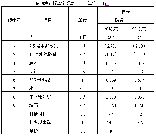 2.某漿砌塊石拱圈工程,跨徑18米,設(shè)計(jì)采用10號(hào)水泥砂漿砌筑,根據(jù)給定的漿砌塊石預(yù)算定額表,試確定水泥、砂和塊石的預(yù)算定額。