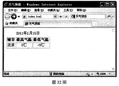32.用HTML語(yǔ)言建立一個(gè)簡(jiǎn)單的網(wǎng)頁(yè),頁(yè)面內(nèi)容為一個(gè)表格。該網(wǎng)頁(yè)在IE瀏覽器中顯示效果如題32圖所示,要求網(wǎng)頁(yè)標(biāo)題為“天氣預(yù)報(bào)”,表格的標(biāo)題為“2011年1月15日”、邊界像素寬度值為1、第一行是表頭、第二行的內(nèi)容水平居中顯示。