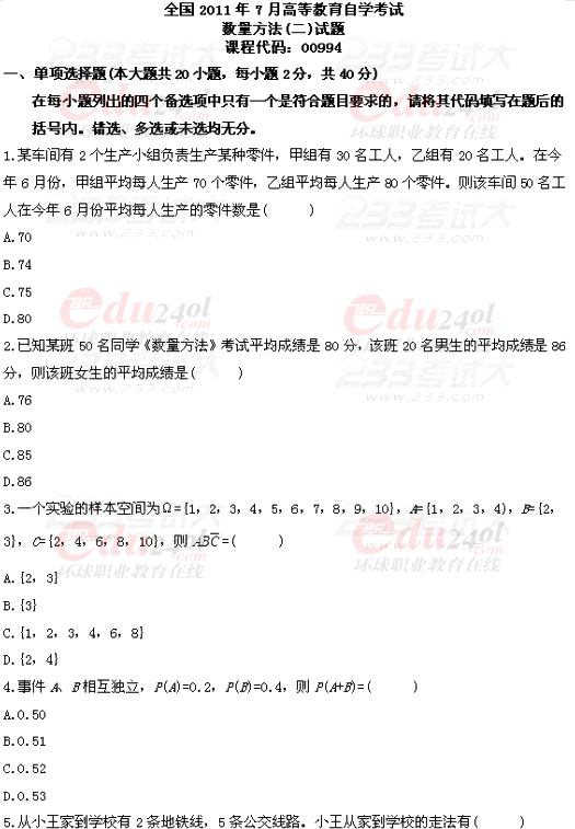 全國(guó)2011年7月自考數(shù)量方法(二)試題