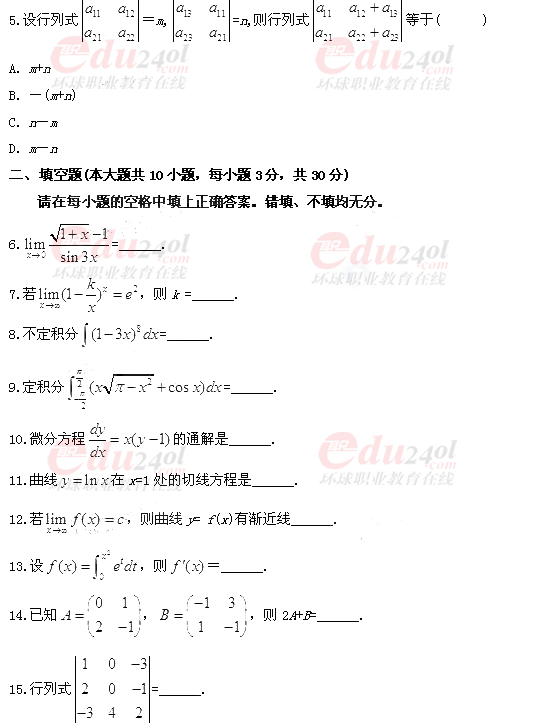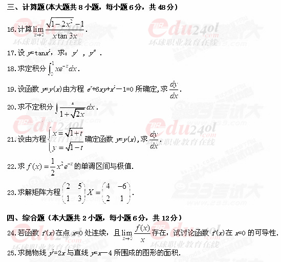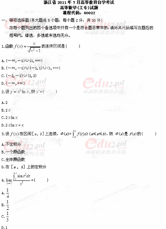 浙江省2011年7月自考高等數(shù)學(xué)(工專(zhuān))試題