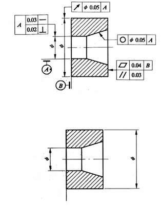 將圖中錯誤的形位公差標注方法改正過來,重新標注(不允許改變形位公差項目及被測要素)。