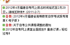 2012年4月福建自考網(wǎng)上報名時間延遲至2月29日,請相互轉(zhuǎn)告