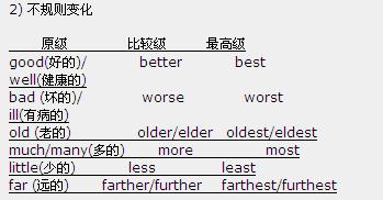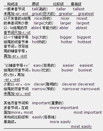 大多數(shù)形容詞(性質(zhì)形容詞)和副詞有比較級和最高級的變化,即原級、比較級和最高級,用來表示事物的等級差別。原級即形容詞的原形,比較級和最高級有規(guī)則變化和不規(guī)則變化兩種。