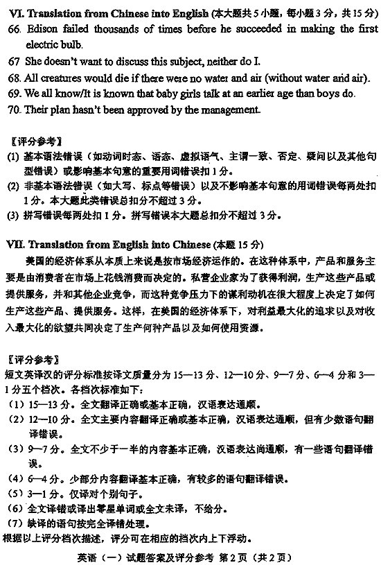 全國2011年10月自考英語(一)參考答案