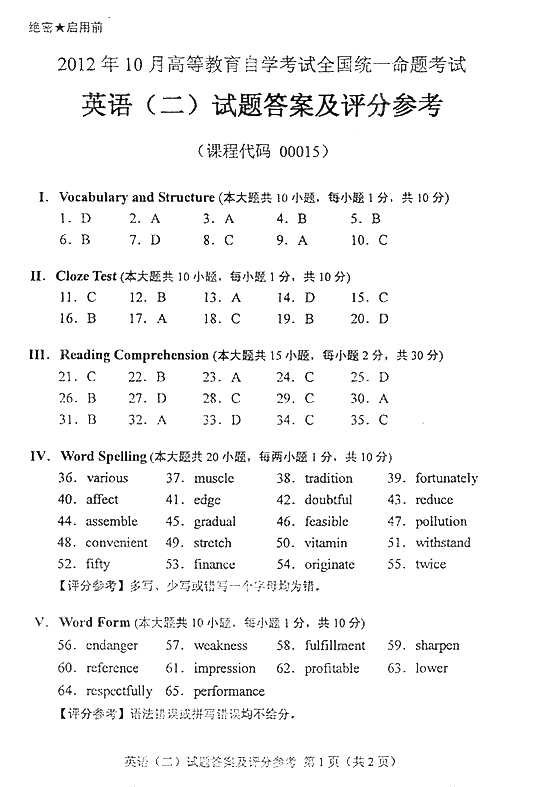 全國2012年10月自考英語(二)參考答案