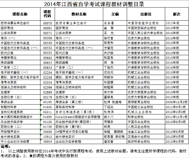 摘要 江西省2014年自考開考課程教材調(diào)整目錄,由環(huán)球網(wǎng)校自考頻道為您提供!
