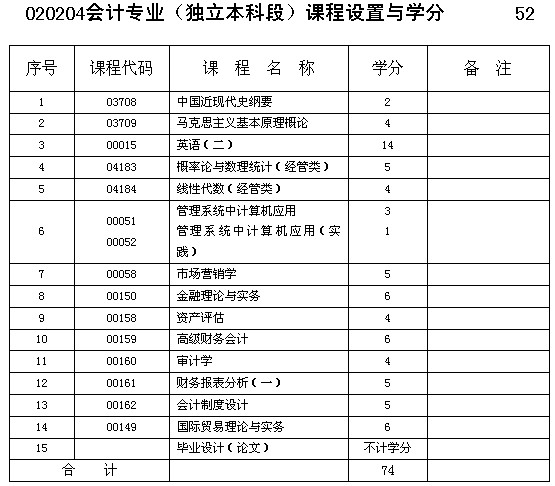 重慶市自考會計專業(yè)(獨立本科段)課程設(shè)置與學分