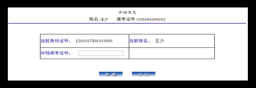 (4) 點(diǎn)擊進(jìn)入,顯示當(dāng)前考號(hào)的身份證號(hào)和姓名,并輸入并檔的準(zhǔn)考證號(hào)