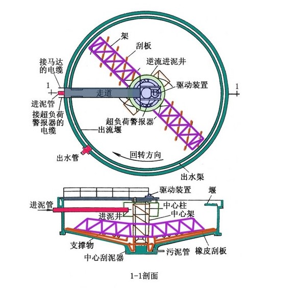 連續(xù)式重力濃縮池分為豎流式和輻流式兩種。輻流式沉淀池的效果比平流式好,因此重力濃縮池通常是輻流式。圓形池的水流通常是從中心配水部分呈輻射狀流至外圍的出水堰,池底通常是傾角較小的圓錐形底。池底設(shè)有刮泥機(jī)將泥刮向中心污泥井,底部帶污泥刮削機(jī)械或設(shè)有漏斗,剩余活性污泥經(jīng)濃縮池中心管流入,上清液由溢流堰溢出稱為出流。濃縮污泥從池底排出,稱為底流。