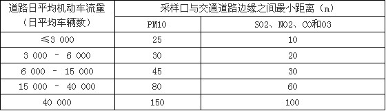 (八)對(duì)于空氣質(zhì)量評(píng)價(jià)點(diǎn),應(yīng)避免車(chē)輛尾氣或其他污染源直接對(duì)監(jiān)測(cè)結(jié)果產(chǎn)生干擾,點(diǎn)式儀器采樣口與道路之間最小間隔距離應(yīng)按下表的要求確定: