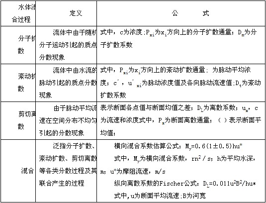 混合是流動(dòng)水體單元相互摻混的過(guò)程,包括:分子擴(kuò)散;紊動(dòng)擴(kuò)散;剪切離散等分散過(guò)程及其聯(lián)合作用,見(jiàn)表4-7。表4--7水體混合過(guò)程(重點(diǎn))