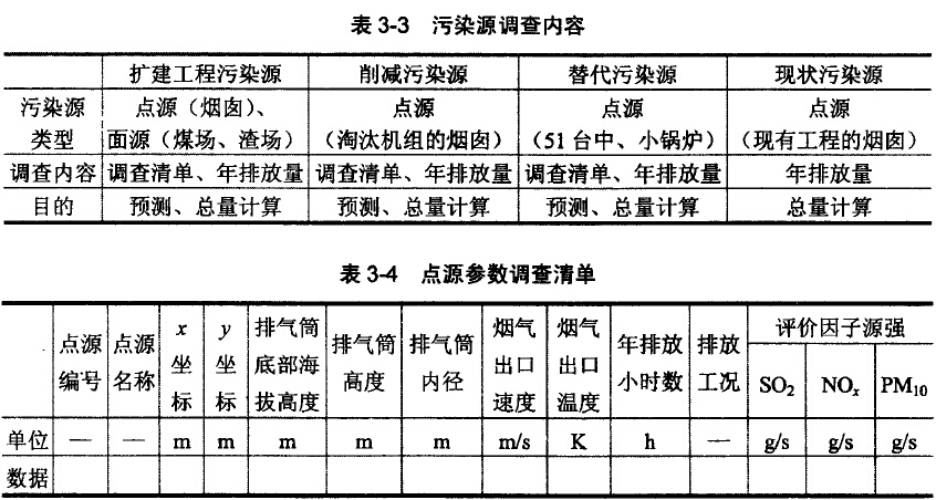 關的在建和未建項目,故不對此項污染源進行調查;對于現(xiàn)有項目和改建、擴建項目的現(xiàn)狀污染源調查,進行了實測,具體過程略。各項項目的點源參數(shù)調查清單和面源參數(shù)調查清單格式見表3-4 和表3-5 。