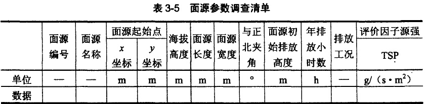 (3 )面源調查內容:面源位置坐標,以及面源所在位置的海拔高度( m ):面源初始排放高度Cm ):各主要污染物正常排放量[g/ (s • m2) ],排放工況,年排放小時數(shù)( h )。