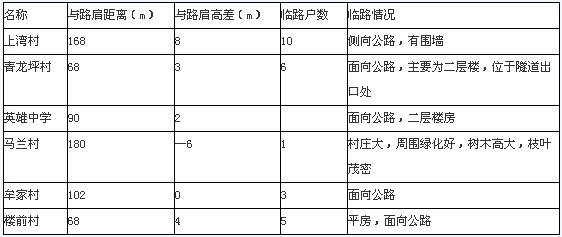 某段高速公路2005年建成通車,建設(shè)單位申請竣工環(huán)境保護(hù)驗(yàn)收。該項(xiàng)目在可行性研究階段完成環(huán)境影響評價(jià)的報(bào)批手續(xù),在初步設(shè)計(jì)和實(shí)際建設(shè)中對線路走向和具體的建設(shè)工程內(nèi)容有少量調(diào)整。該段高速公路全長50公里,設(shè)計(jì)時(shí)速80公里/小時(shí),設(shè)1104米特大橋一座,中小橋若干座,特大橋橋面設(shè)排水孔;雙洞單向隧道2座,單洞長3200米,互通式立交1處,分離式立交1處,服務(wù)區(qū)1處,取土場8處,棄渣場20處,共征用土地206公頃,公路所經(jīng)地區(qū)為山嶺重丘區(qū),其中通過水土流失重點(diǎn)治理區(qū)的線路長度5公里,特大橋從A城市的集中式飲用水源二級保護(hù)區(qū)邊界跨越。由于線路偏移,聲環(huán)境敏感點(diǎn)由原來的12處變?yōu)?處,其中4處與環(huán)評審批時(shí)一致,8個(gè)取土場有2個(gè)分布在水土流失重點(diǎn)監(jiān)督區(qū),有1個(gè)在重點(diǎn)治理區(qū),棄渣場均分布在沿線的溝壑,服務(wù)區(qū)靠近一人口約2000人的村莊,設(shè)有1.5噸/小時(shí)燃煤鍋爐一座,煙囪高度20米,服務(wù)區(qū)廢水經(jīng)化糞池處理后排放到服務(wù)區(qū)外沖溝,經(jīng)過 100米匯入經(jīng)該村的小河上游,公路沿線部分敏感點(diǎn)情況見下表: