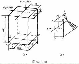 [例5-10—2] 矩形截面短柱承受荷載P1、P2作用如圖5—10—10所示。試求固定端截面上角點A、B、C及D處的正應(yīng)力,并確定該截面中性軸的位置。